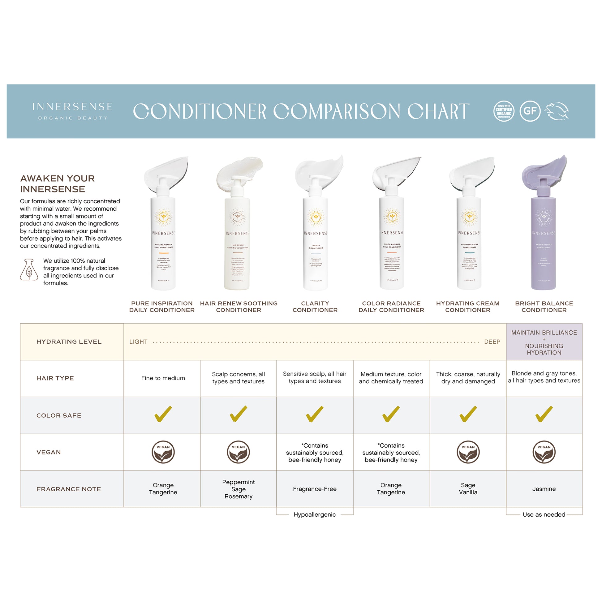 Water/Aqua/EAU, Cetearyl Alcohol, Hamamelis Virginiana (Witch Hazel) Water, Glycerin, Cocos Nucifera (Coconut) Oil*, Behentrimonium Methosulfate, Alcohol, Stearalkonium Chloride,Sodium Levulinate, Potassium Sorbate, Citric Acid, Guar Hydroxypropyltrimonium Chloride, Butyrospermum Parkii (Shea) Butter*, Cucurbita Pepo (Pumpkin) Seed Oil*, Oryza Sativa (Rice)Bran Oil, Oryza Sativa (Rice) Extract*, Persea Gratissima (Avocado) Oil*, 2,6-Dimethyl-7-octen-2-ol, Orange Terpenes, Triethyl Citrate, Basic Blue 99, Sodium Gluconate, Basic Red 76, HydrolyzedRice Protein, Hydrolyzed Quinoa, Angelica Archangelica Root Extract, Allyl Heptoate Natural, Alpha-Terpineol, Amyris Balsamifera Bark Oil, Anisaldehyde, Benzyl Acetate, Beta-Ionone, Citronel-lol, Dimethyl Heptenal, Dodecahydro Tetramethyl Naphthofuran, Eugenia Caryophyllus (Clove) Leaf Oil, Eugenol, Gamma Decalactone, Gamma Nonalactone, Gamma-Undecalactone, HexenylAcetate, Hexyl Acetate, Hexyl Cinnamal (Hexyl Cinnamic Aldehyde), Lemon Oil Terpenes, Methyl Benzoate, Phenethyl Acetate, Phenethyl Alcohol, Raspberry Ketone, Rosmarinus Officinalis(Rosemary) Leaf Oil, Vanillin, Camellia Sinensis Leaf Extract, Cucumis Sativus (Cucumber) Fruit Extract, Mangifera Indica (Mango) Fruit Extract, Persea Gratissima (Avocado) Fruit Extract,Stearyl Alcohol, Amine HCL, Sodium Benzoate, Benzyl Alcohol, Citronellol†, Limonene†, Linalool†.*Certified Organic†A Natural Component of Essential Oils 100% Natural Fragrance