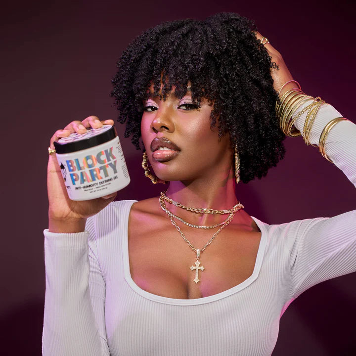 The Block Party Collection is a salon-grade styling system engineered for textured hair in humid climates. This performance-driven line fights frizz, minimizes shrinkage, and extends the life of your style - whether it’s a wash-and-go, twist-out, or sleek finish. Each formula delivers firm hold, high shine, and fast drying time, blending professional results with everyday ease.
